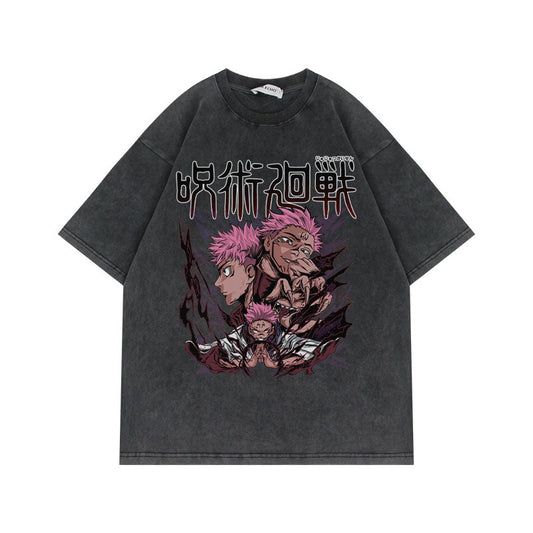280G Heavyweight Washed Old Vintage Short Sleeve T Shirt Anime Spell Return Battle American High Street Oversize Top