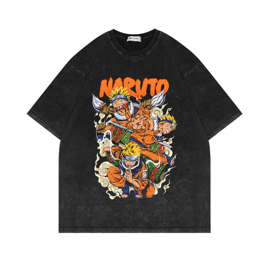 280G Heavyweight Washed Old Short Sleeve T shirt Naruto Anime American Retro Oversize Half Sleeve Cotton