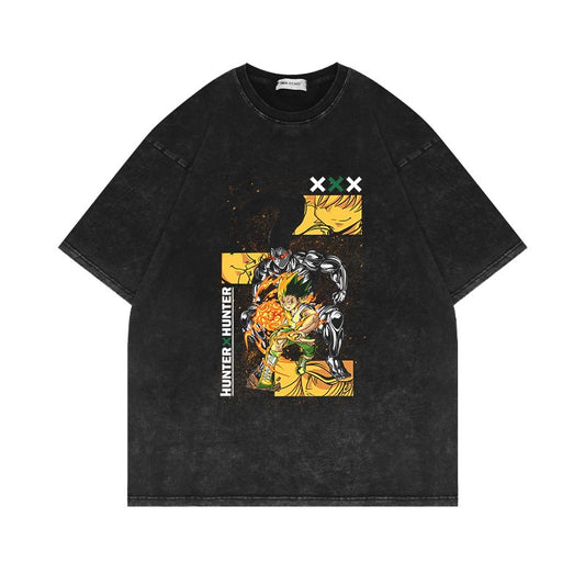 280G Heavyweight Washed Old Short Sleeve T Shirt Full Time Hunter Anime Oversize American Vintage High Street Half Sleeve