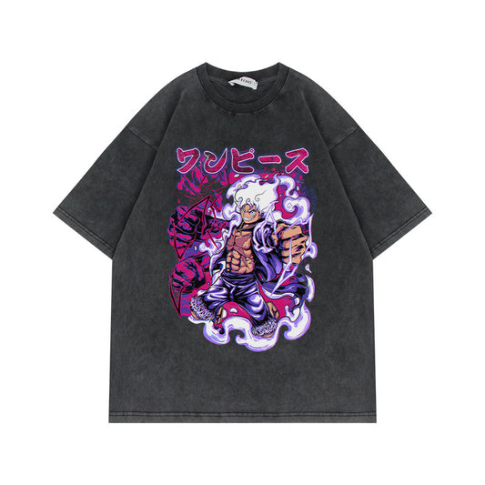 230G Heavyweight Washed Old Half Sleeve T Shirt American Vintage Oversize Anime Pirate King Luffy Short Sleeve T